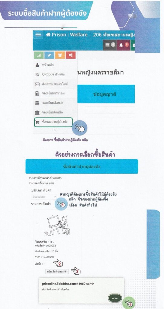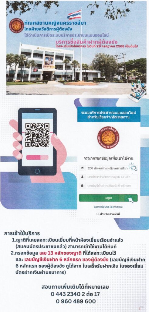 การเข้าใช้บริการ1.ญาติที่เคยลงทะเบียนเยี่ยมที่หน้าห้องเยี่ยมเรือนจำแล้ว (สแกนบัตรประชาชนแล้ว) สามารถเข้าใช้งานได้ทันที2.กรอกข้อมูล เลข 13 หลักของญาติ ที่ได้ลงทะเบียนไว้ และ เลขบัญชีเงินฝาก 6 หลักแรก ของผู้ต้องขัง (เลขบัญชีเงินฝาก 6 หลักแรกดูได้จากใบเสร็จรับฝากเงิน / ใบจองเยี่ยม / บัตรฝากเงินผ่านธนาคาร)